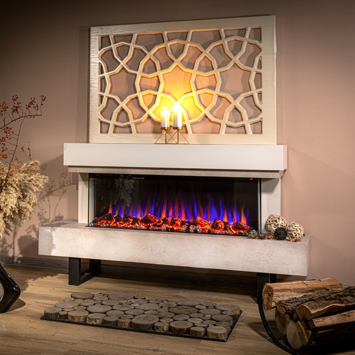 Startseite Elektrokamine mit Kaminkonsole Premium Elektrischer Kamin Monro & Dalas, Art Flame, 750x1400x300 mm, 1500W, 30 Farbkombinationen, Thermostat, Brennholz und Kristalle